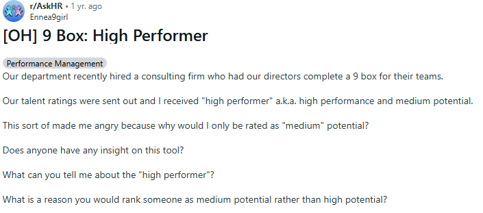 Reactions like the one you see from a Reddit user below are not uncommon when employees are exposed to the 9 box analysis. Commenters on the thread note that wherever employees are plotted on the grid, it’s best that their manager and leadership teams are the only ones exposed to this information.